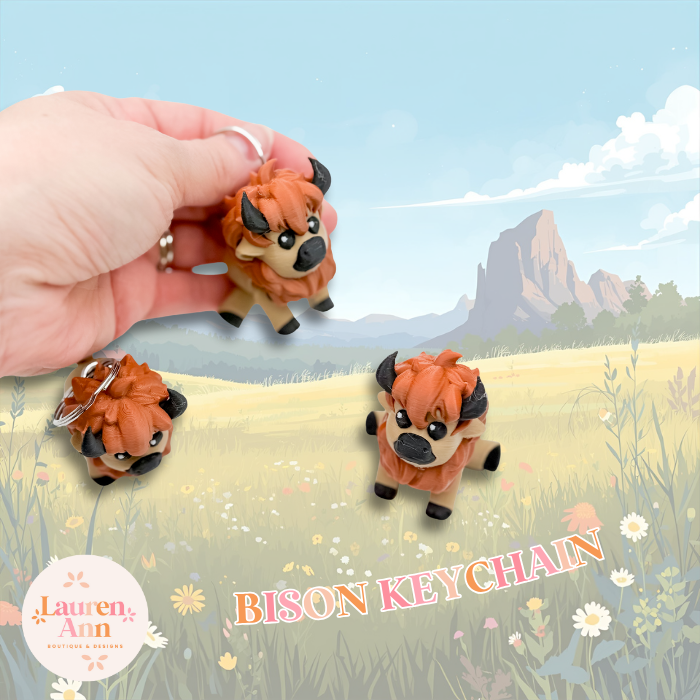 3d printed keychain, bison keychain, buffalo keychain, animal keychain, cute keychain, western keychain, wildlife keychain, handmade keychain, 3d printed gift, bison charm, buffalo charm, animal lover gift, unique keychain, backpack charm, bag charm, zipper pull, stocking stuffer, birthday gift, nature lover gift, western gift, buffalo gift, bison accessory, handmade animal keychain, 3d printed bison, cute buffalo, kawaii animal keychain